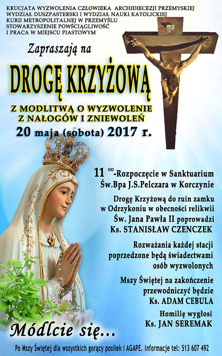 Krucjata Wyzwolenia Człowieka Archidiecezji Przemyskiej, Wydział Duszpasterski i Wydział Nauki Katolickiej Kurii Metropolitalnej w Przemyślu oraz Towarzystwo „Powściągliwość i Praca” w Miejscu Piastowym zapraszają w sobotę, 20 maja 2017 r. do Korczyny na Drogę Krzyżową z modlitwą o wyzwolenie z nałogów i zniewoleń.
