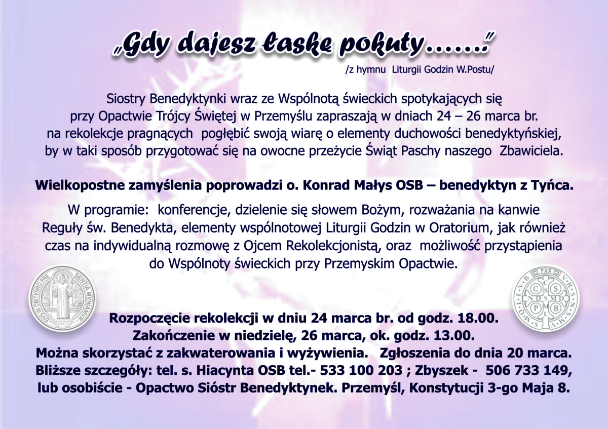 Siostry Benedyktynki wraz ze Wspólnotą świeckich spotykających się przy Opactwie Trójcy Świętej w Przemyślu zapraszają w dniach 24–26 marca br. na rekolekcje pragnących pogłębić swoją wiarę o elementy duchowości benedyktyńskiej, by w taki sposób przygotować się na owocne przeżycie Świąt Paschy naszego Zbawiciela.