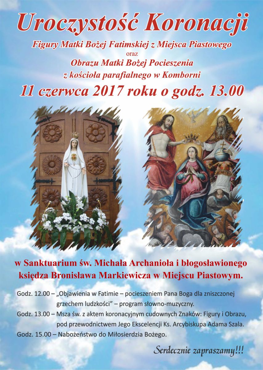 Wszystkich czcicieli Matki Bożej zapraszamy na uroczystość koronacji figury Matki Bożej Fatimskiej z Miejsca Piastowego oraz obrazu Matki Bożej Pocieszenia z kościoła parafialnego w Komborni.