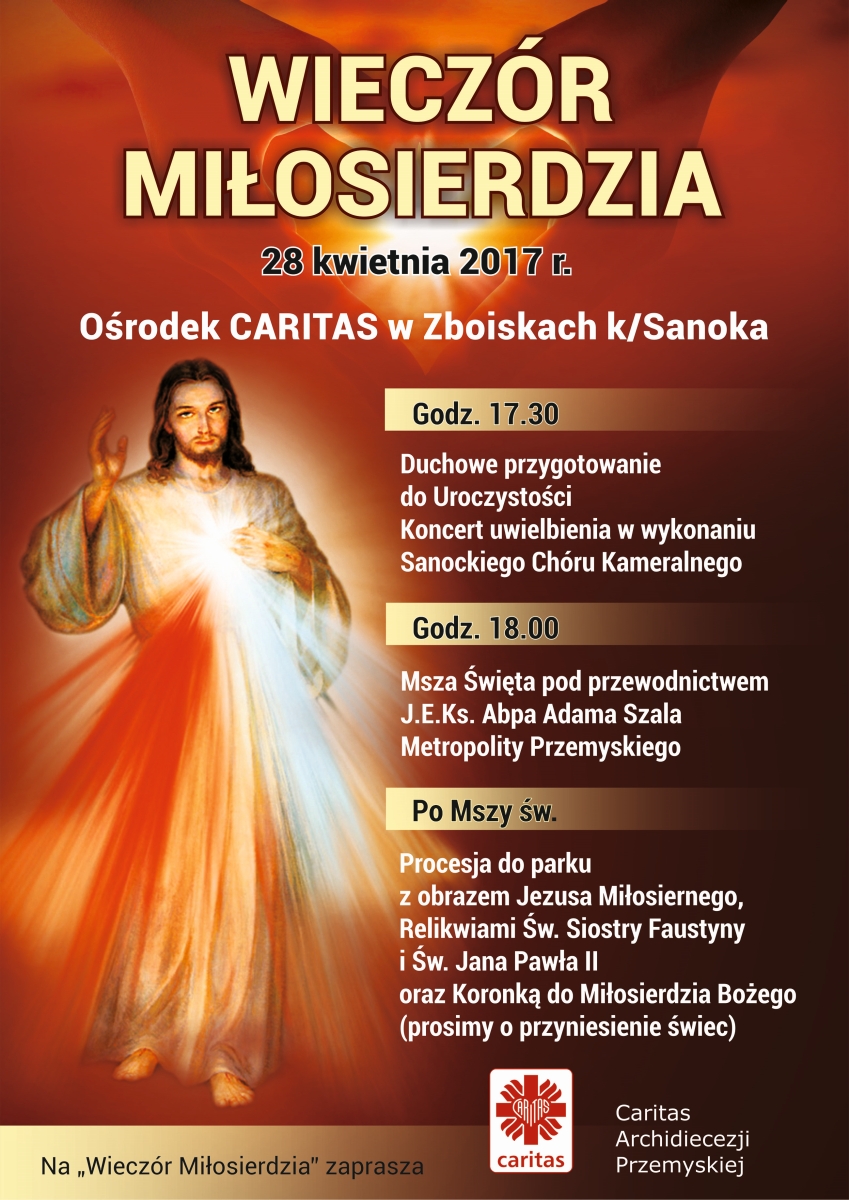 Caritas Archidiecezji Przemyskiej zaprasza w piątek, 28 kwietnia 2017 r. do Ośrodka Rekolekcyjnego w Zboiskach na kolejny Wieczór Miłosierdzia z modlitwą Koronki do Bożego Miłosierdzia i procesją ze światłem. Nabożeństwu będzie przewodniczył Metropolita Przemyski, abp Adam Szal.