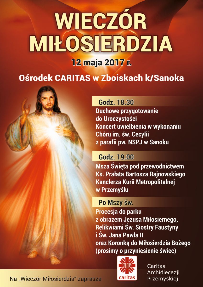 Caritas Archidiecezji Przemyskiej zaprasza w piątek, 12 maja 2017 r. do Ośrodka Rekolekcyjnego w Zboiskach na kolejny Wieczór Miłosierdzia z modlitwą Koronki do Bożego Miłosierdzia i procesją ze światłem. Nabożeństwu będzie przewodniczył ks. prał. Bartosz Rajnowski, Kanclerz Kurii Metropolitalnej w Przemyślu.
